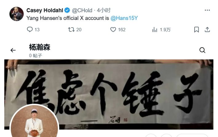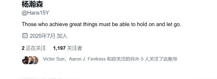 杨瀚森在本月也是正式注册了个人的推特账号,尤其是其简介中放了一张“焦虑个锤子”字幅,而签名则是“成大事者,须能坚守亦能释怀。”杨瀚森的如此签名与横幅,均是极具中国新生代网友的特色。