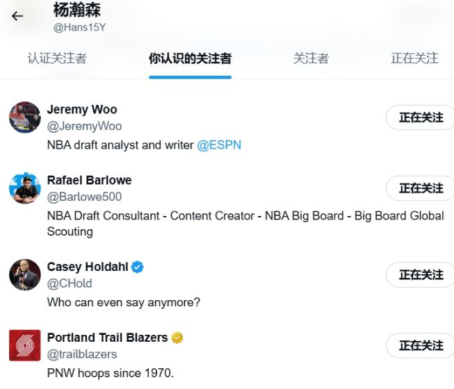 至于在杨瀚森的个人推特账号当中,他关注了多位开拓者跟队记者和开拓者官方账号。